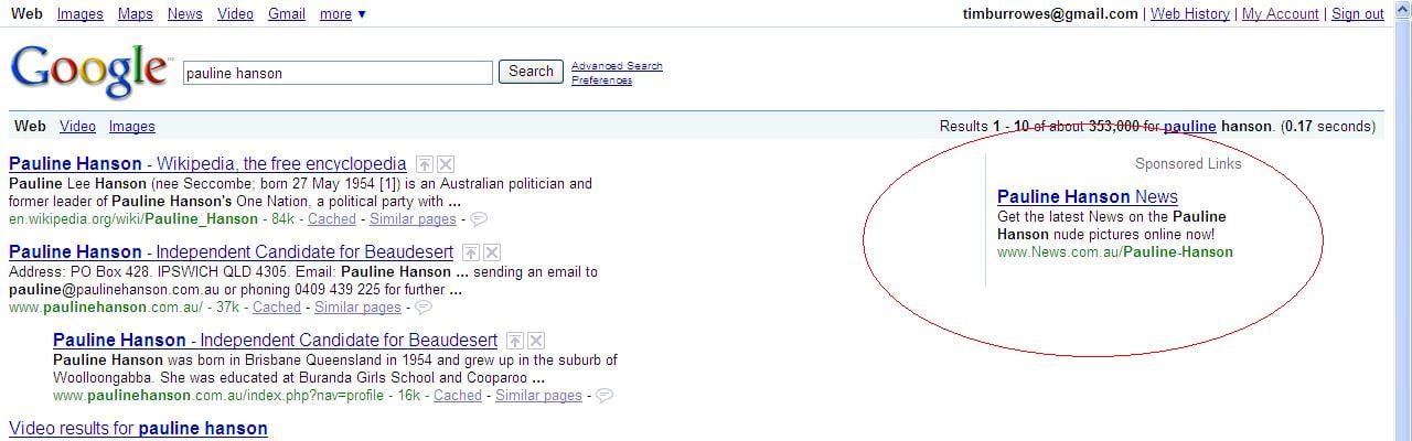 将“pauline hanson”类型进入谷歌,弹出什么?付费链接敦促读者:“获取最新消息鲍林汉森现在在线裸照!“它链接到什么?news.com.au当然。