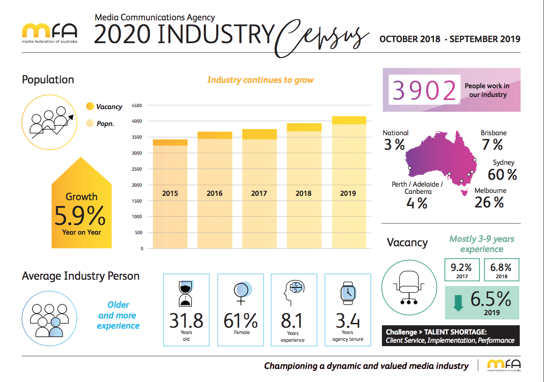 根据澳大利亚媒体联合会(MFA)今天发布的年度行业普查,媒体机构管理职位的女性人数上升了7个百分点,达到44%。