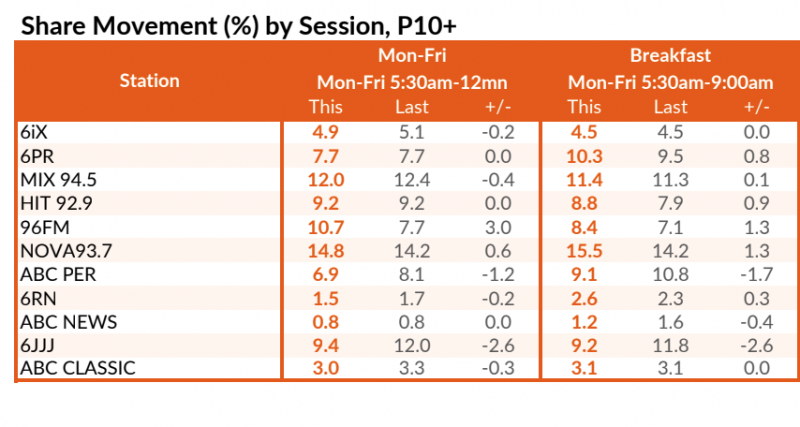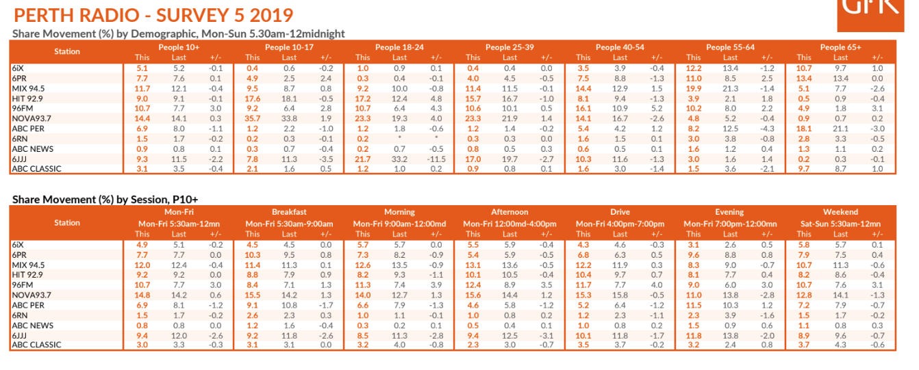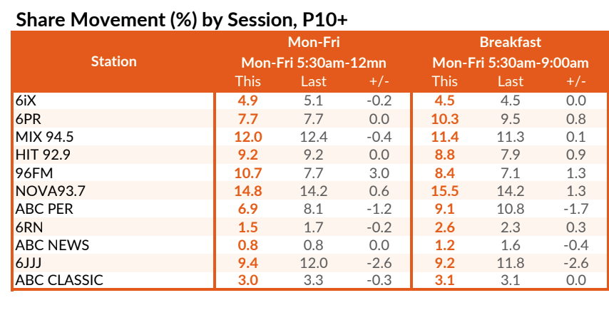 GfK电台收视率调查五见过澳大利亚广播网(攻击)' s 96 FM在珀斯早餐份额取得重大进展,攀升8.4%,至1.3。
