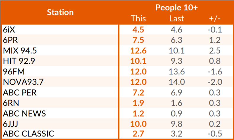 在珀斯的一次大变动中,Mix 94.5以2.5个百分点的涨幅跃升至市场首位从第一次调查的10.1%上升到12.6%。