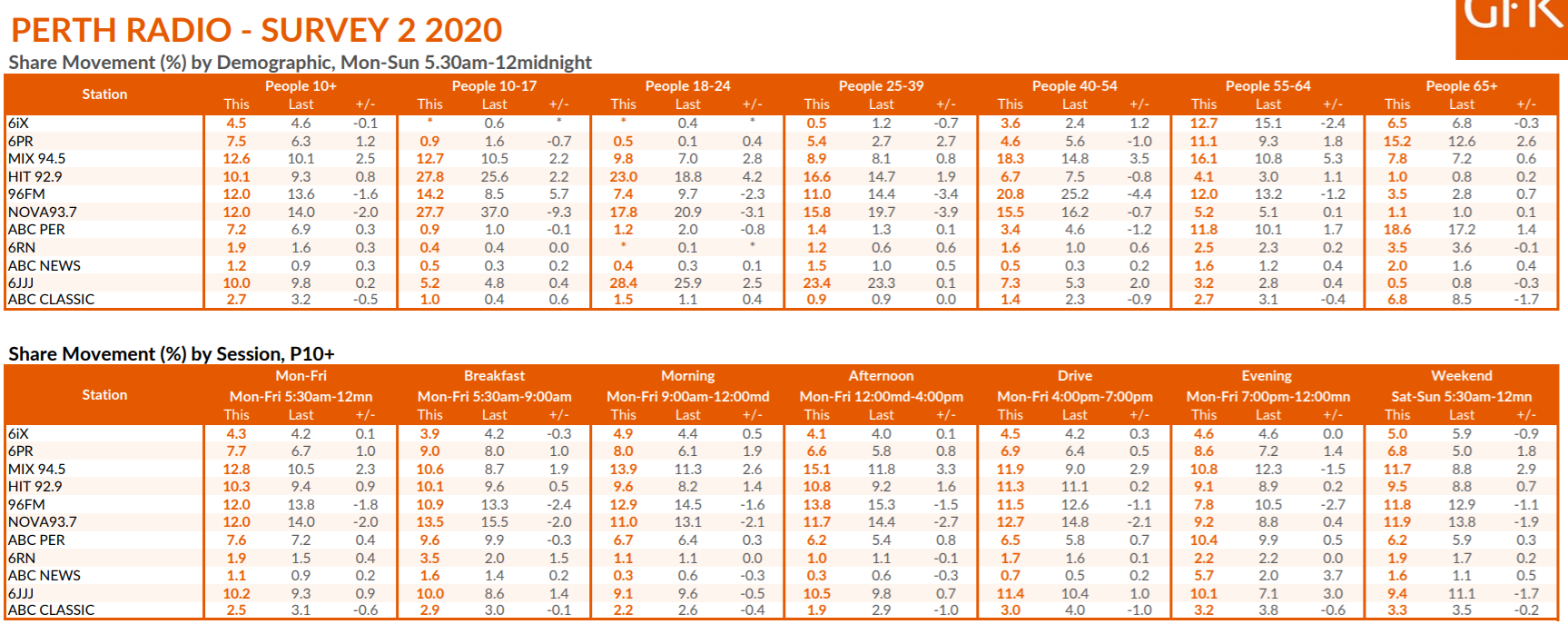 珀斯的早餐收视率也出现了大幅下降,《内森、纳特和肖恩》在Nova 93.7上的收视率下降了2.0个百分点,至13.5%,但该节目仍然保持了榜首的位置。Botica的Bunch在96 FM上也下降了2.4个百分点至10.9%,但再次保住了第二的位置。Triple J上升1.4个百分点,为10.0%,Mix 94.5上升1.9个百分点,为10.6%。