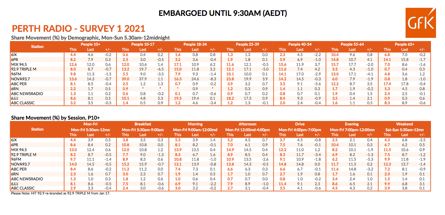 SCA的全新广播电台,92.9 Triple M Perth,开始略微倾向于0.7点到总体份额8%。现在,该车站的早餐秀由EX-6PR主机罗勒Zempilas领导,占据7.7%的听力,下降-1.3分。