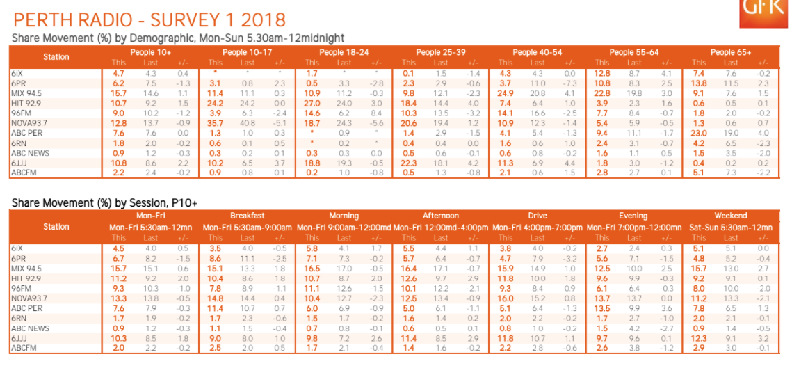 总体而言,在2018年的调查1中,Mix以15.7%的观众份额赢得了珀斯市场。Nova 93.7以12.8%的用户份额位居第二。