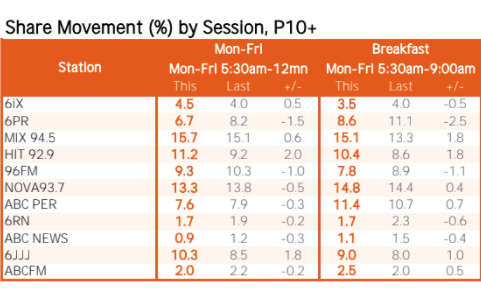 SCA的Mix在早餐时段占据主导地位(克莱尔西、马特和金巴)该公司的市场份额上升了1.8个点,至15.1%。Nova (Nathan, Nat & Shaun)紧随其后,其份额上升了0.4个百分点,达到14.8%。达到92.9 (海蒂·安德森,泽维尔·埃利斯,瑞安·乔恩)它的观众份额也上升了1.8个百分点,达到10.4%.