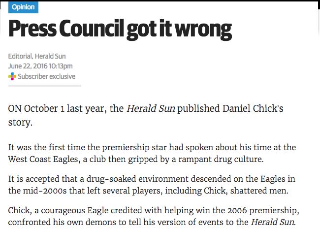 新闻集团(News Corp)旗下《先驱太阳报》(Herald Sun)对澳大利亚新闻委员会(Australian Press Council)的谴责进行了回击,该委员会指责新闻集团未能就毒品指控征求《西海岸雄鹰》(West Coast Eagles)的意见,称该裁决是“监管机构越权的一个例子”。