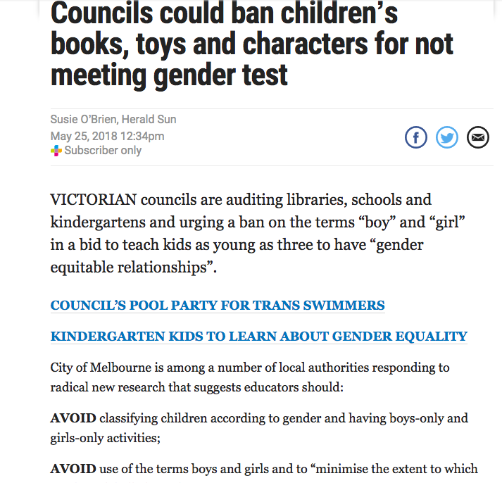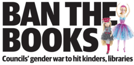 这篇发表于2018年5月21日的文章刊登在头版,标题为“禁书:地方议会的性别战争将打击幼儿园和图书馆”。故事在第二页继续,标题为“最受欢迎的儿童故事面临性别禁令”。