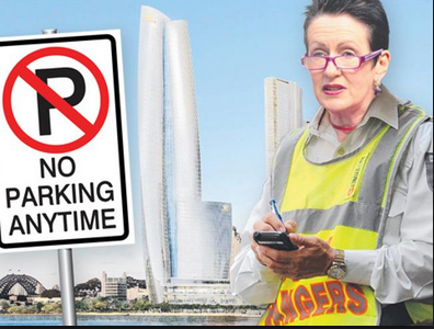 在第一篇题为“Clover要求禁止赌场车”的文章中,市长打扮成一名停车检查员,站在Barangaroo门前,旁边的标志上写着“任何时候都禁止停车”,这张照片是经过数字处理的。