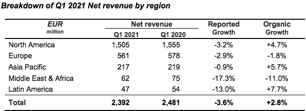 亚太地区增长加速,恢复了正的有机增长5.7%。中国是第一个受到COVID-19大流行影响的国家,有机增长超过3.0%,“因为它开始受益于过去18个月的一系列强劲胜利,”萨杜恩说。此外,印度和澳大利亚在第一季度都出现了“动态的有机增长”。
