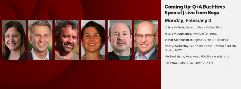 今年Q&A的第一集,以及新的主宿主哈米什麦克唐纳,已被迫搬迁,周一之夜的丛林大火特殊生活从Bega被视为危险火条件恶化。在堪培拉,特别集团将拍摄超过两小时以上的时间以上。