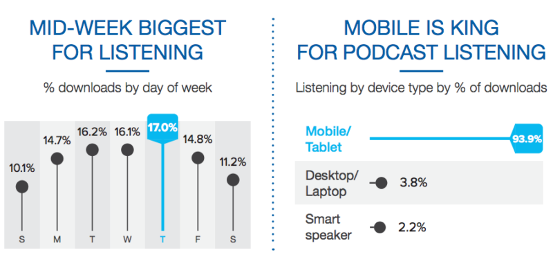 不出所料,移动和平板电脑收听是最受欢迎的播客消费方式,占今年所有播客收听量的93.3%,台式机/平板电脑收听量占3.8%,智能音箱仅占2.2%。