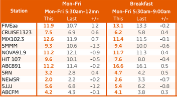 Mix的丽莎和皮特驾驶团队以1.9个百分点的份额位居榜首,达到16.2%,超过了Nova的全国联合节目凯特、蒂姆和马蒂,后者仅增长了0.1个百分点,达到15.7%.