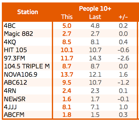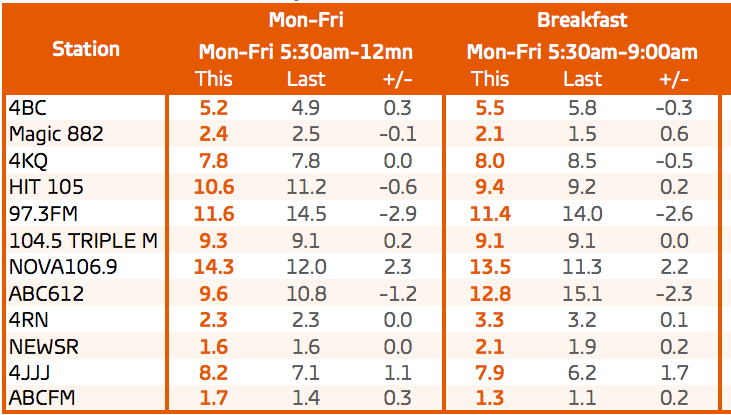 Dave Hughes和Kate Langebroek以10.2%的份额(上升0.1个百分点)保持了KiisFM的总冠军位置,领先于Nova的Kate Ritchie, Tim Blackwell和Marty Sheargold,他们的份额大幅上升1.4个百分点,达到10.1%。