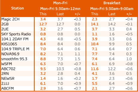 麦格理电台的2UE成功地逆势上涨0.3个点,占4%的份额,这主要归功于其早餐节目上涨0.4%。