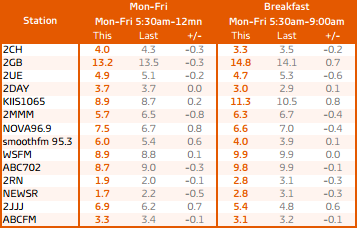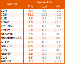 2GB在今年以12.1分的总份额排名第一,比上次调查下降了0.2分,而澳大利亚广播网络的WSFM以8.9分的份额排名FM排行榜第一,保持着稳定的KiisFM的8.6分。