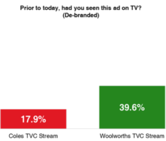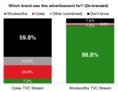 The research was undertaken to test the effectiveness of both spots, and Forethought noted that it had flagged prior to the study that showing only still assets may disadvantage Woolworths as it removed its ‘highly recognisable audio asset/jingle’, however it commented that “the strong utilisation of other distinctive Woolworths brand assets overcame this hurdle, with the commercial scoring very high on both recognition and brand association”.
