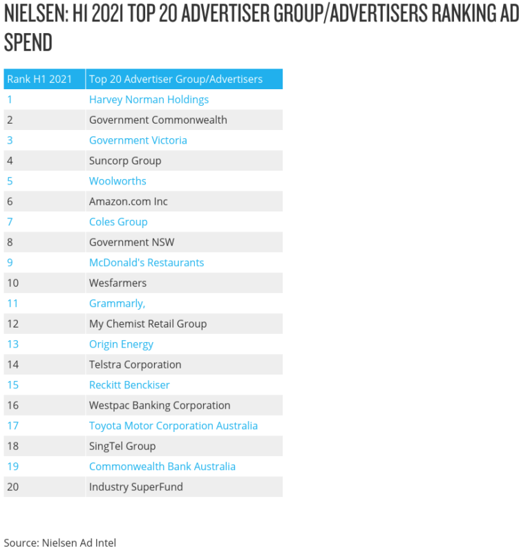 组级别花,哈维诺曼保留主要零售广告商的榜首。政府广告支出今年上半年明显增加,其中大部分份额被联邦政府和维多利亚时代的政府。