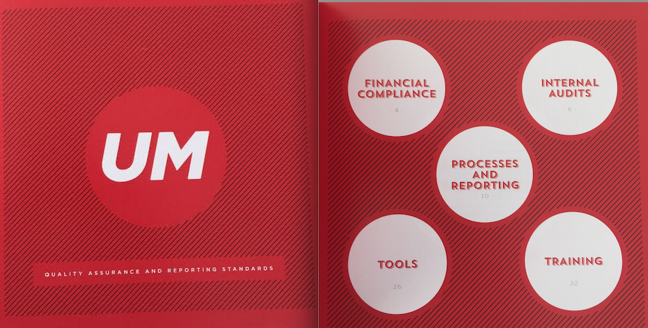 嗯的小册子“质量保证和报告标准”将透明度问题分为五类:财务合规、内部审计、流程和报告工具和培训。