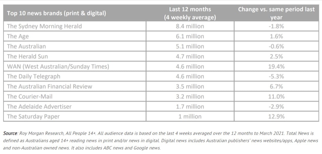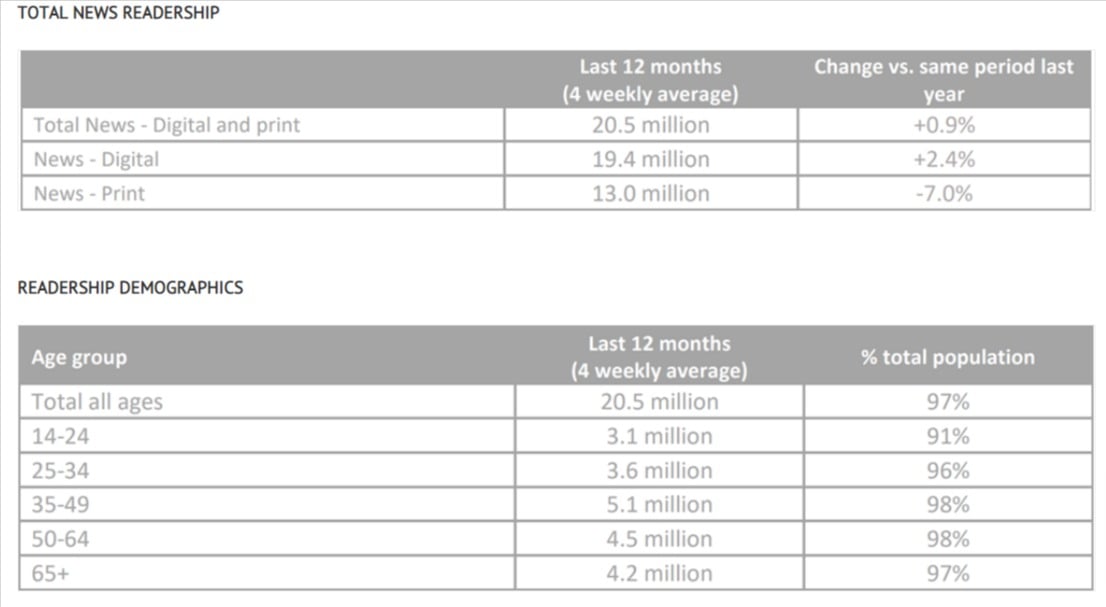 罗伊·摩根(Roy Morgan)为thinknewsbrands制作的读者数据是指截至2022年3月的12个月,并表明总新闻达到了14岁以上人口的97%。Total News代表所有新闻品牌(印刷和数字)和新闻网站作为一个媒体频道。