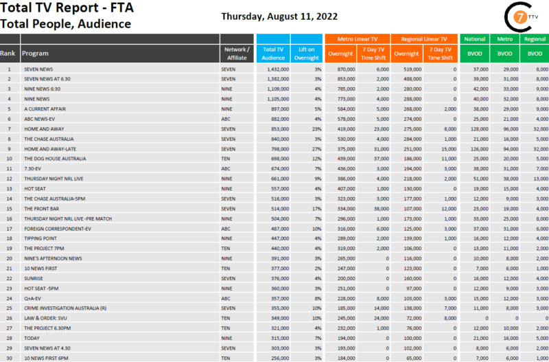 在8月10日的最新每日整合电视报告中,七个新闻以143.2万电视观众排名榜首,其中包括BVOD上的37,000名观众,增长了3%。最高振奋人心的节目是七个家庭和远方观看,升高为27%,总共有798,000名国家观众观看,而BVOD则为126,000。