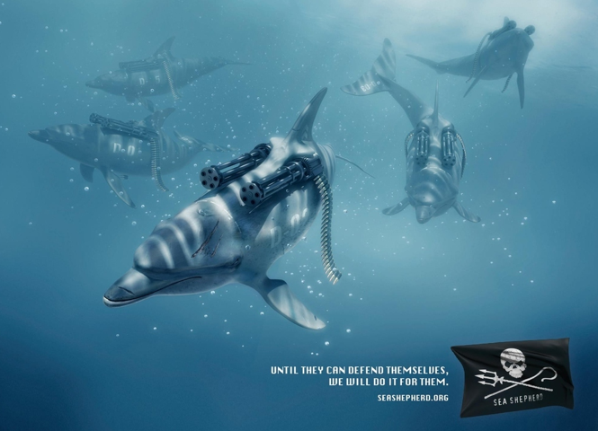 海洋守护者协会近年来制作了一些极具冲击力的广告,尤其是在海外,比如“除非他们能自卫,否则我们将为他们而战”的宣传活动,该活动以携带导弹和机枪的鲸鱼和海豚为特色。