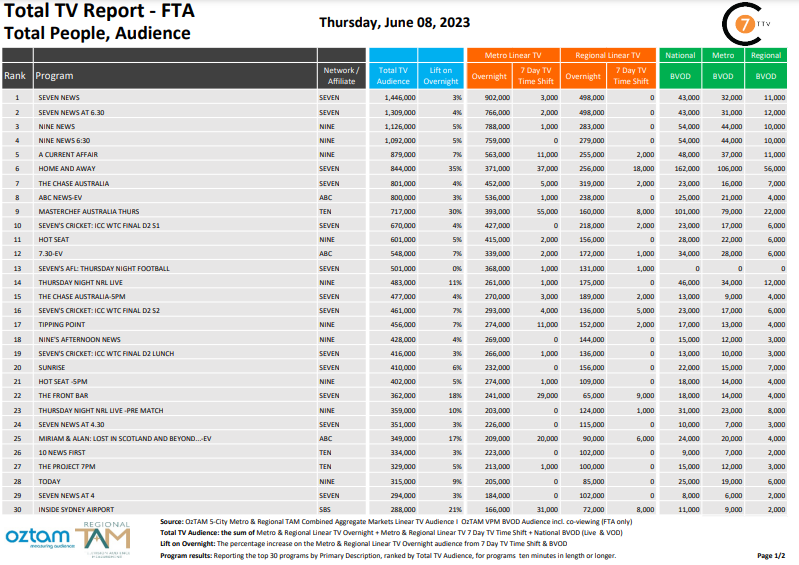 最近每天巩固7总电视报道6月8日,七个消息是# 1项目总144.6万电视观众,其次是与130.9万年七六点半新闻。7新闻有一个隆起的3%和BVOD 43000观众。
