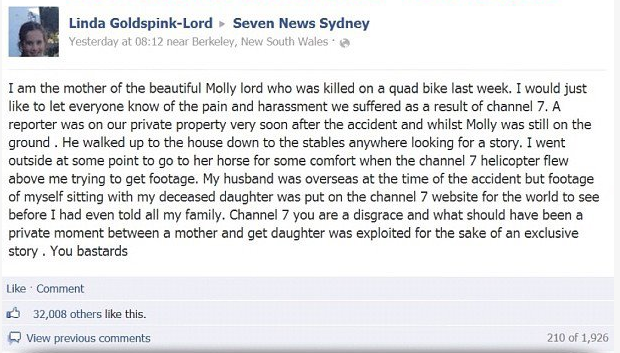 “我的母亲美丽莫莉领主四轮摩托车上周被杀。我想让每个人都知道我们遭受的痛苦和骚扰通道7的结果。记者在事故发生后很快我们的私有财产,而莫莉仍在地上。他走到马厩的房子在任何地方寻找一个故事。我走到外面去她的马一些安慰当上面的频道7架直升机飞我想让画面。我丈夫当时海外的事故,但自己坐着的镜头我已故的女儿是7频道网站上,让全世界都可以看到之前我甚至告诉我所有的家人。频道7你是一个耻辱,什么应该是一个私人的时刻一个母亲和得到(原文如此)的女儿之间利用为了独占的故事。你混蛋。”