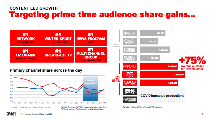 Warburton承诺继续“重新定位业务”,并指出七个内容战略作为增长的道路。大哥,农民想要一个妻子,SAS:谁敢赢,AFL对观众份额的影响,他说,七个有2021年的“无与伦比的日程安排”。