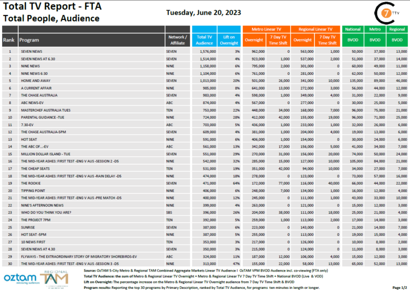 最近每天巩固7总电视报道6月20,七个消息是# 1项目总157.6万电视观众,与国家BVOD和50000年提高3%。