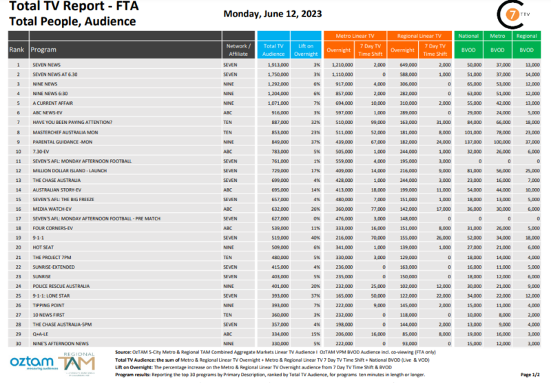 7新闻# 1程序的最新每日巩固7总电视报道6月12日,总191.3万电视观众,3%隆起和BVOD 50000观众。