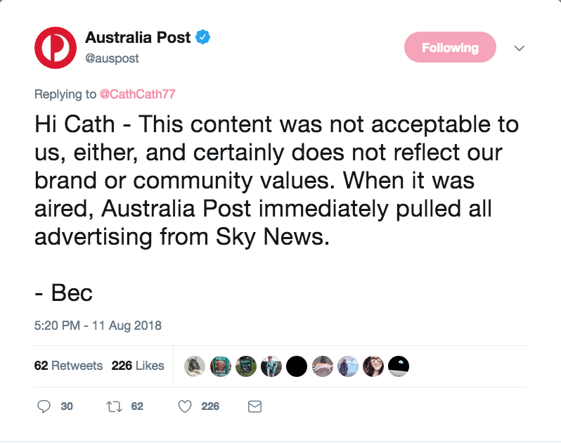 昨天,采访的余波还在继续澳大利亚邮政证实,它是最新一个从该车站撤下广告的品牌。