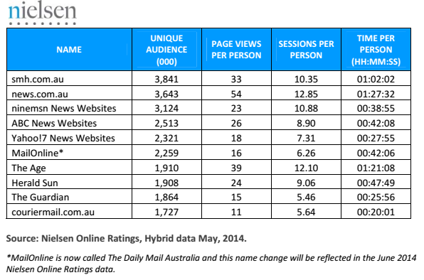 尼尔森在线收视率(Nielsen Online Ratings)认为,smh.com.au的读者人数比news.com.au多出近20万,月读者人数估计为380万。新的海外挑战者MailOnline,两周前,《澳大利亚每日邮报》更名为《每日邮报》,以及《卫报》,上个月庆祝了在澳大利亚运营一周年,两者均创下收视纪录,分别以225万和186万观众名列第六和第九。