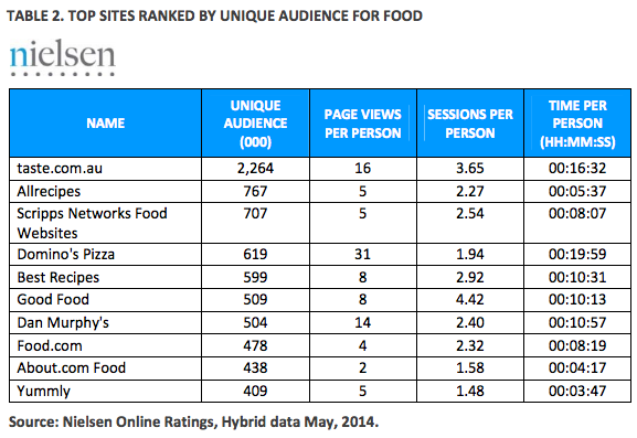 尼尔森还发布了食品类的在线数据,该数据显示,新闻集团旗下的tast.com.au以220万的独特受众位居榜首,而达美乐披萨在该类别中排名第四。