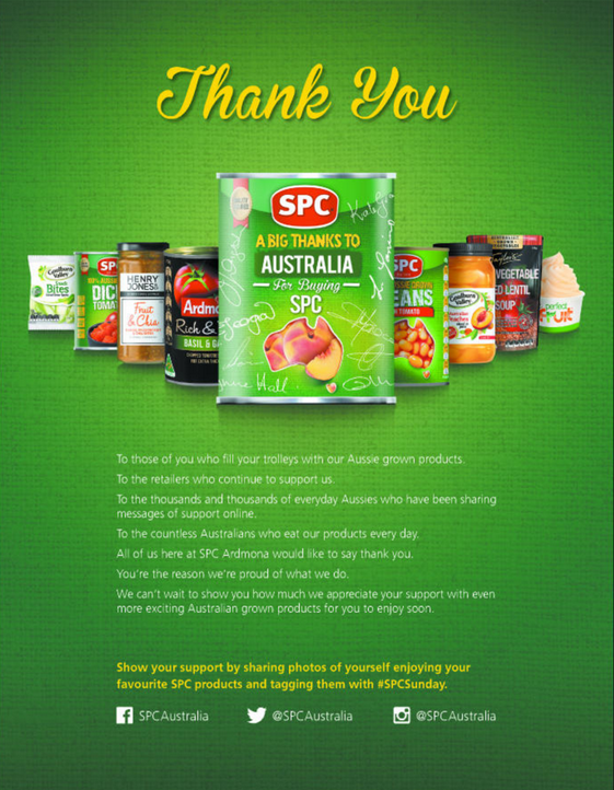 SPC Ardmona在《每日电讯报》中印刷了战术“谢谢”广告,感谢人们在麻烦中的支持。