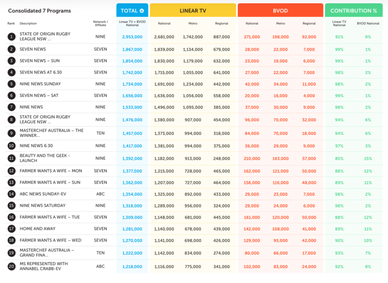 Nine的原籍国已超过VOZ的第二个电视前20个节目“合并7个受众”报告,最新版本的报告今天在虚拟OZ网站上落下。