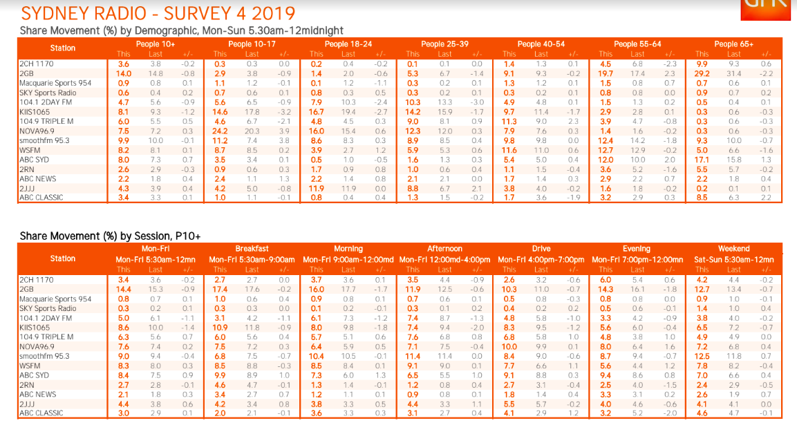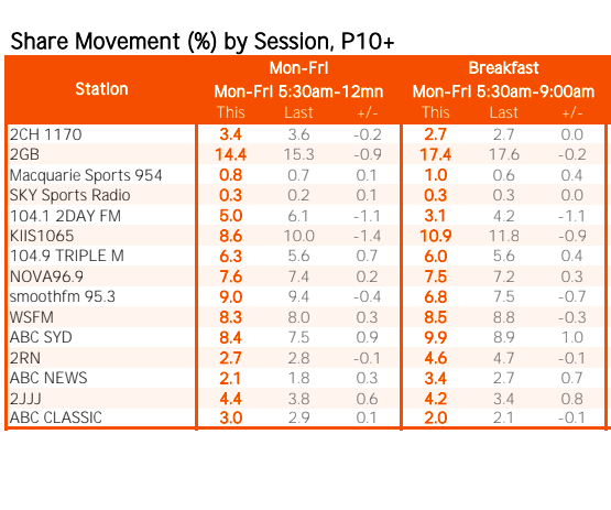 总体而言,悉尼2GB的份额为14.0%,低于上次调查的14.8%。