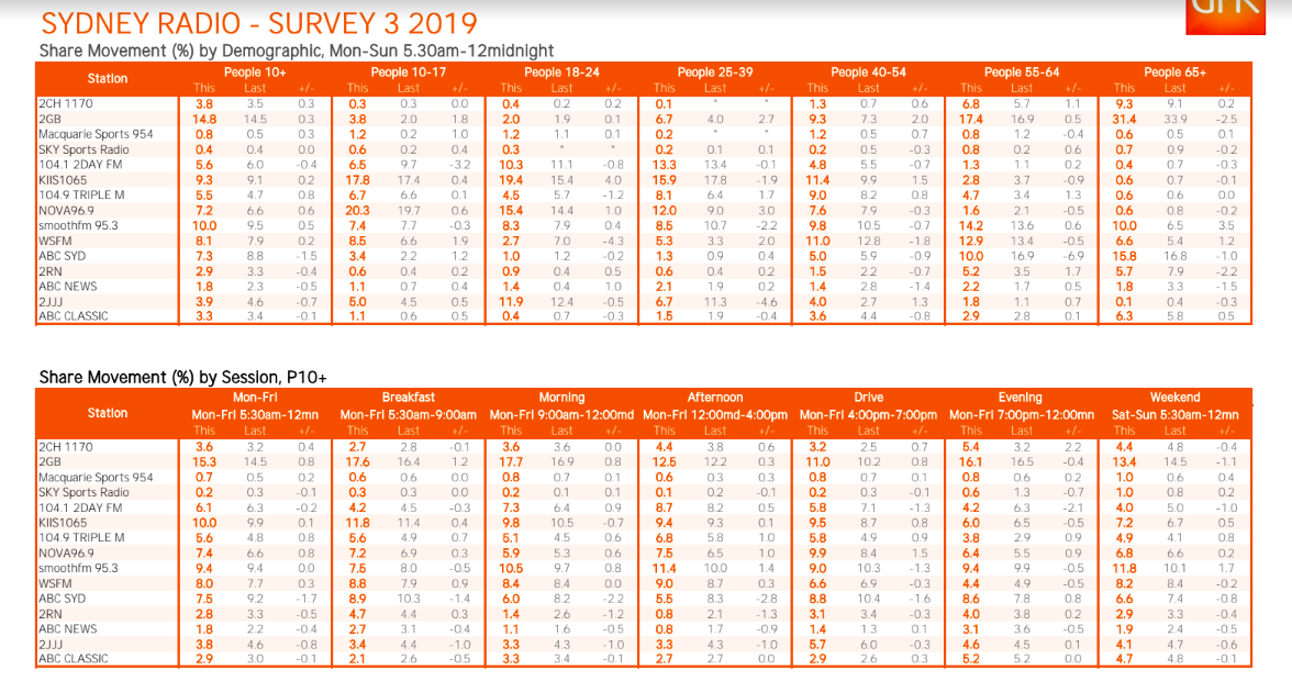 嗨,我不得不说这些广播收视率是不可靠的,因为只有一小部分人听什么?调查参与者是如何挑选的?也许有偏见的方面?我知道很多人根本不听收音机。我有时听ABC或Nova和其他一些电台。我不听2GB的,因为那里的大多数广播公司都很幼稚,他们一直在讲自己的垃圾,把他们的垃圾强加给那些可能在听的人。