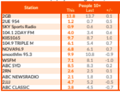 福特汉姆在早餐排行榜上的成功体现在整体排名中,2GB在10+人口中以13.8%的份额位居榜首,上升了0.1个百分点。再次,上升或下降相对较小,平滑FM紧随其后,为9.9%(回落0.9个百分点),其次是Kiis(9.7%,上升1个百分点),ABC悉尼(8.5%,上升0.2个百分点),WSFM(7.1%,下降1个百分点)。