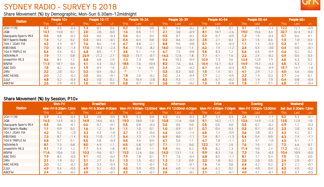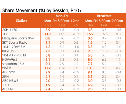 2GB仍是悉尼最大的电台,占14.1%的份额,WSFM占据FM的王冠,增长了0.6个百分点,占11.3%的份额。Nova的市场份额上升了0.8个百分点,达到7.9%,而Smooth FM的市场份额为9.6%,成为悉尼第二大FM电台,2day FM的市场份额下降了0.7个百分点,达到4.2%,而Triple M的市场份额为5.4%。