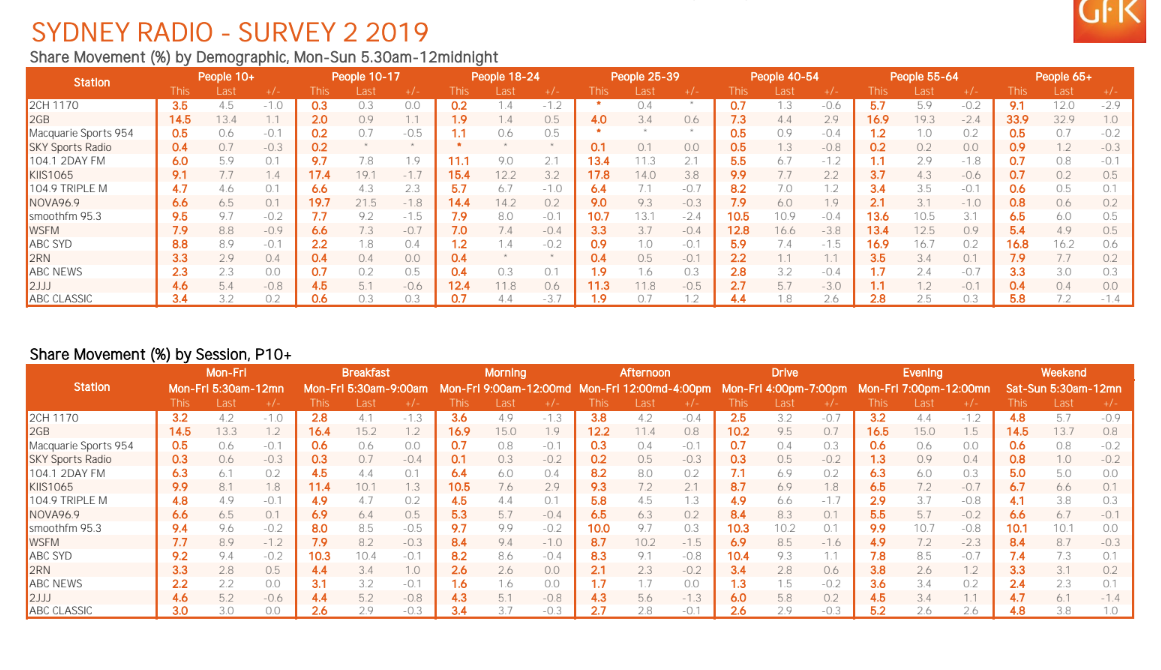 2019年第二次电台调查的结果表明,Alan Jones仍然是悉尼早间早餐市场的冠军,而Kiis上的Kyle and Jackie O Show仍然主导着FM市场。