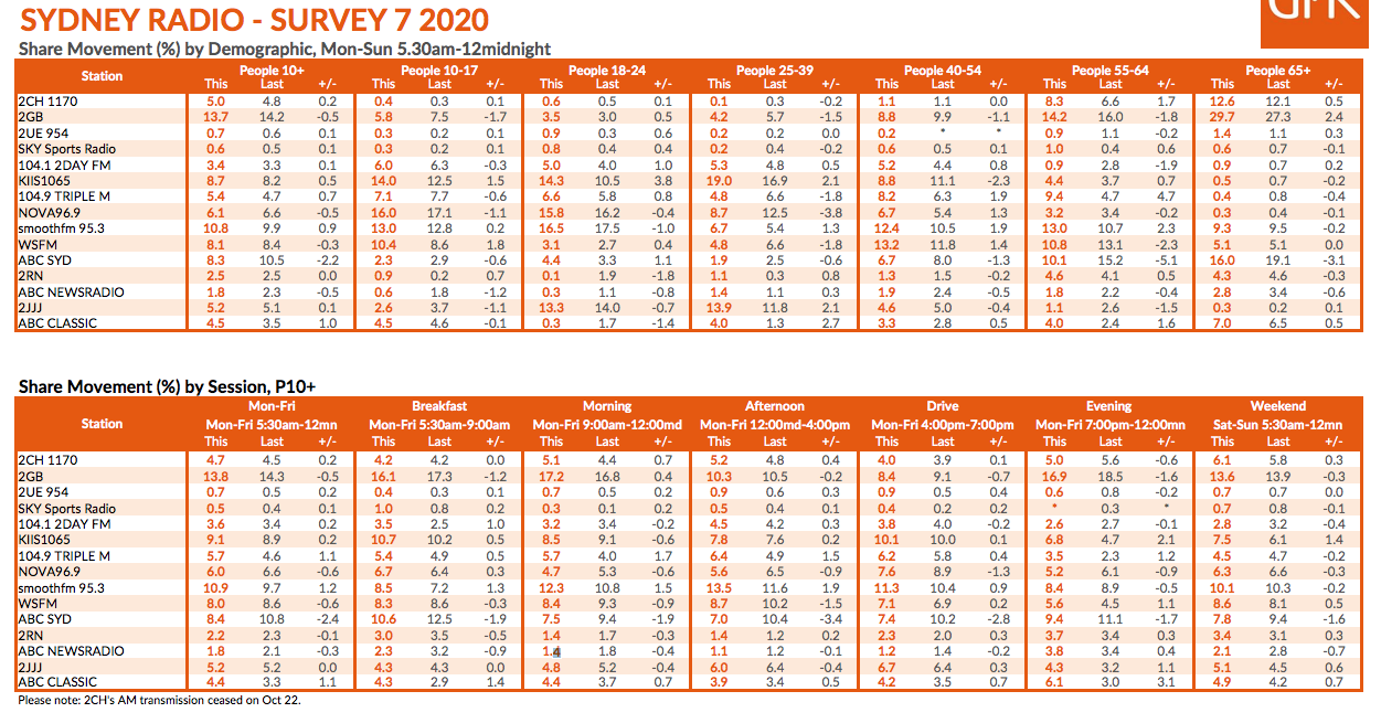 2GB仍然是悉尼市排名第一的电台,尽管收视率下降了0.5分,仅占13.5%的市场份额。