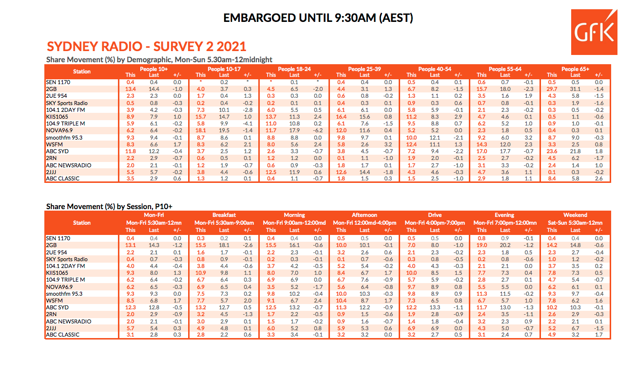 在2020年不可预测的2020年之后,悉尼市场似乎恢复了正常的服务,GFK的第二次无线电调查与前Covid调查引人注目的相似之处。