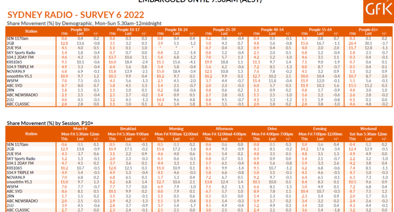 KIIS FM的Kyle & Jackie O在FM早餐广播中保持了第一名的位置,但再次是Nine的Ben Fordham保持了第一名的头衔,尽管在2022年的第六次广播收视率调查中失去了听众,但这本书在悉尼总体上获得了2GB的冠军。见上次调查结果在这里.