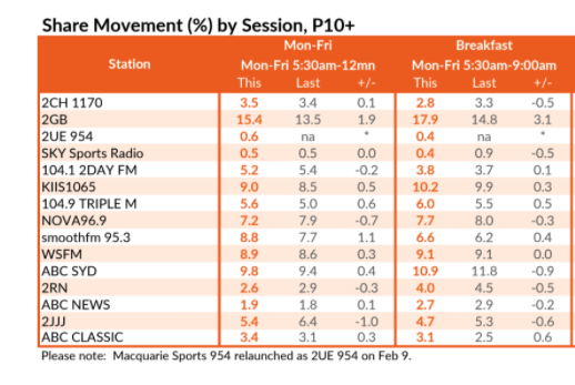 2GB由艾伦·琼斯(Alan Jones)主持的早餐节目在时段内保持不变,占17.9%的份额,比上次调查上升3.1个百分点。ABC电视台的温迪·哈默(Wendy Harmer)和罗比·巴克(Robbie Buck)尽管下跌了0.9个百分点,仅占10.9%的市场份额,但仍稳居第二。