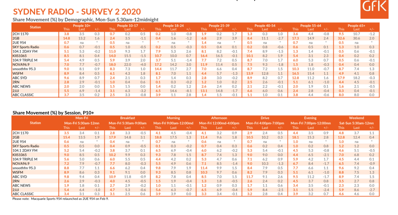 在整体观众份额方面,2GB(14.8%)和ABC悉尼(9.6%)领先于流畅的FM。