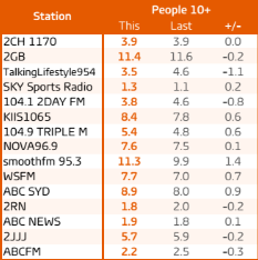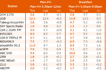 ABC 702的周一至周日份额为8.9%,上升0.9分,而2ue的Talking Lifestyle损失了1.1个评级点,份额为3.5%。