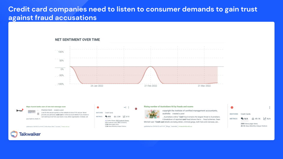 在整个季度,围绕信用卡的社交媒体对话是负面的,除了2月份进入中立领土的短暂峰值。