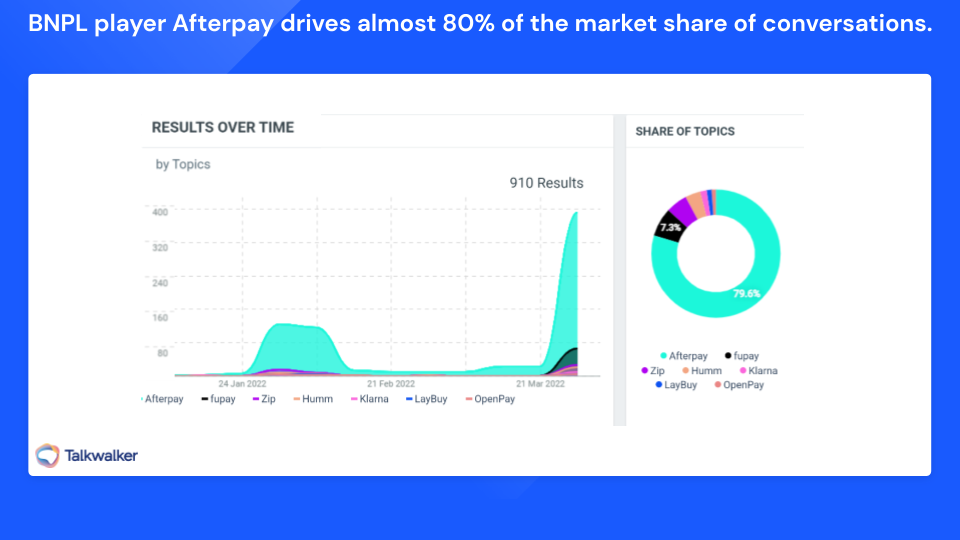 AfterPay在该领域的对话中占主导地位,将近80%的文章和帖子都提到了该品牌。