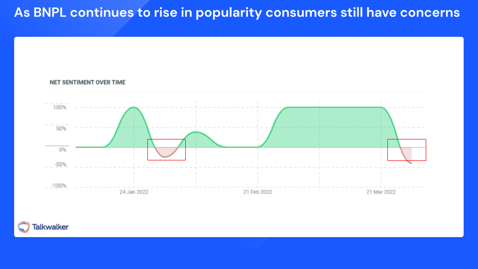 “When looking at how sentiments surrounding BNPL have changed over time, it’s clear that the conversations were largely positive except for two periods in the quarter – the first occurring in late January, the second at the end of March,” said Cara Buscaglia, Talkwaker’s chief innovation and insights officer.