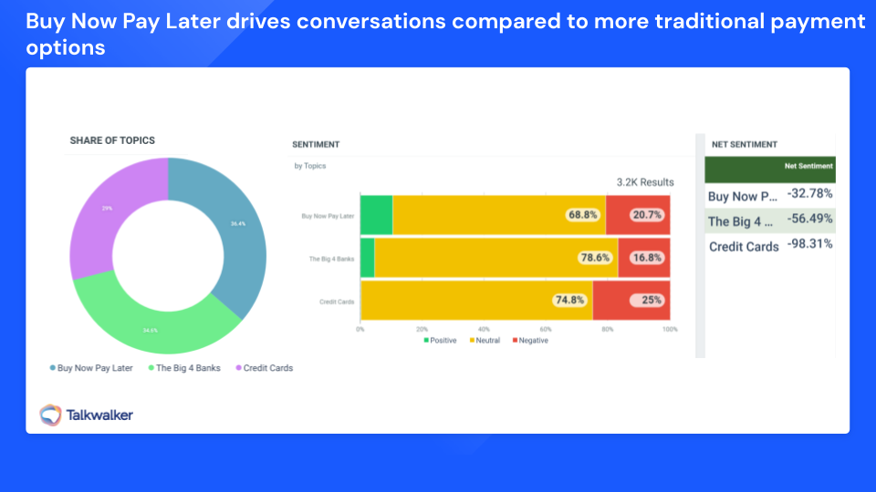 在分析了有关这三个主题的澳大利亚社交媒体对话之后,Talkwalker发现它们之间没有很多日光。尽管在此期间进行了更多的BNPL对话,但分裂相对均匀。