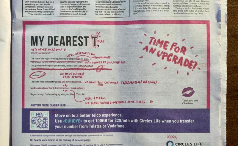 圈子的生活在去年在澳大利亚市场上取名在《快递邮件》中发布了一封分手信,看起来像一个叫夏洛特的女人离开了她的伴侣T,但后来被发现是鼓励澳大利亚人与电信公司分手的广告。